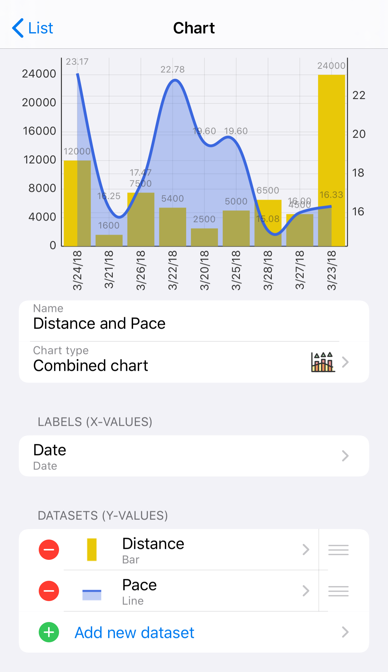- Add datasets to the chart by tapping on Add new dataset in the Datasets section. The Edit Dataset view is displayed where you edit the dataset properties.