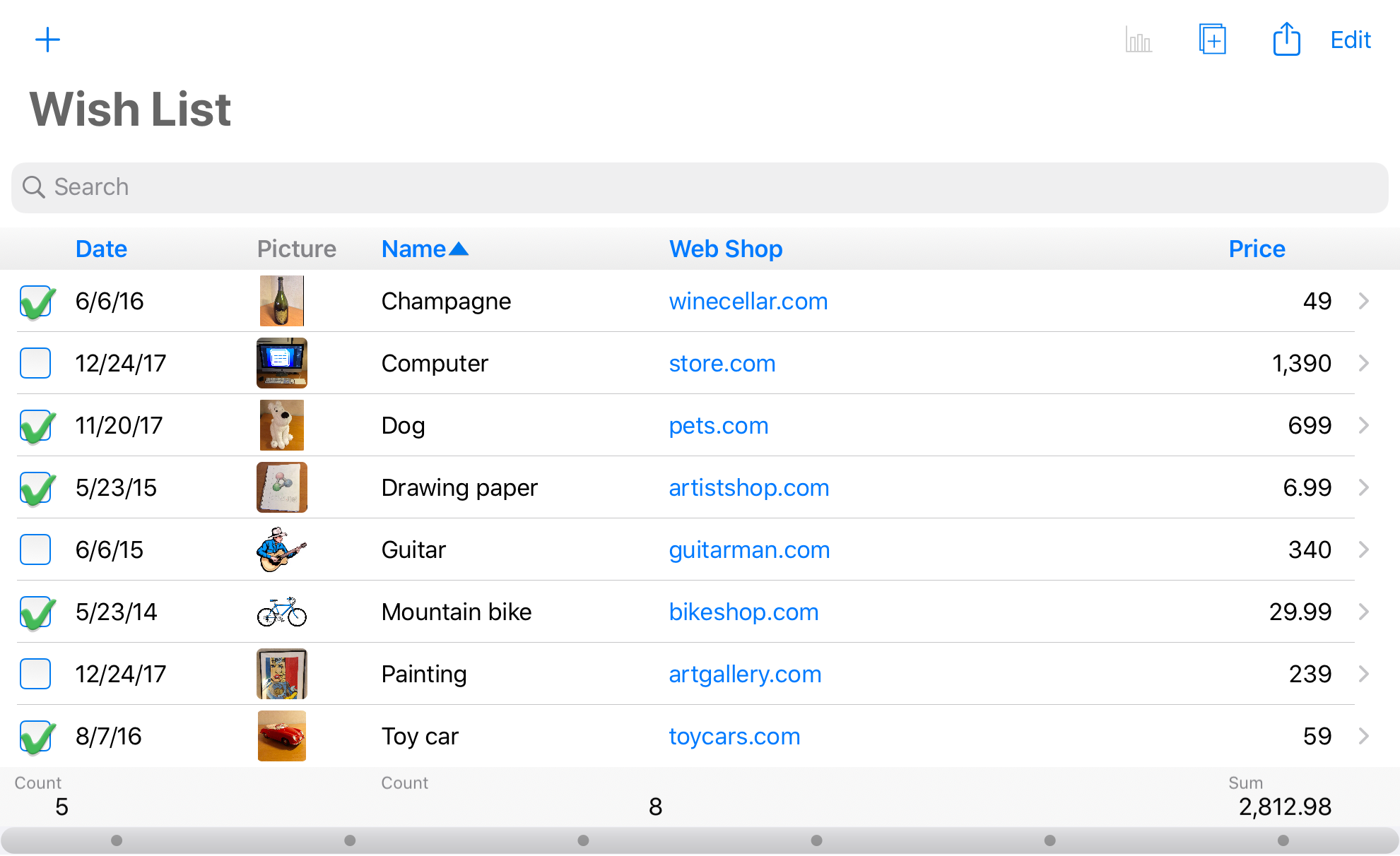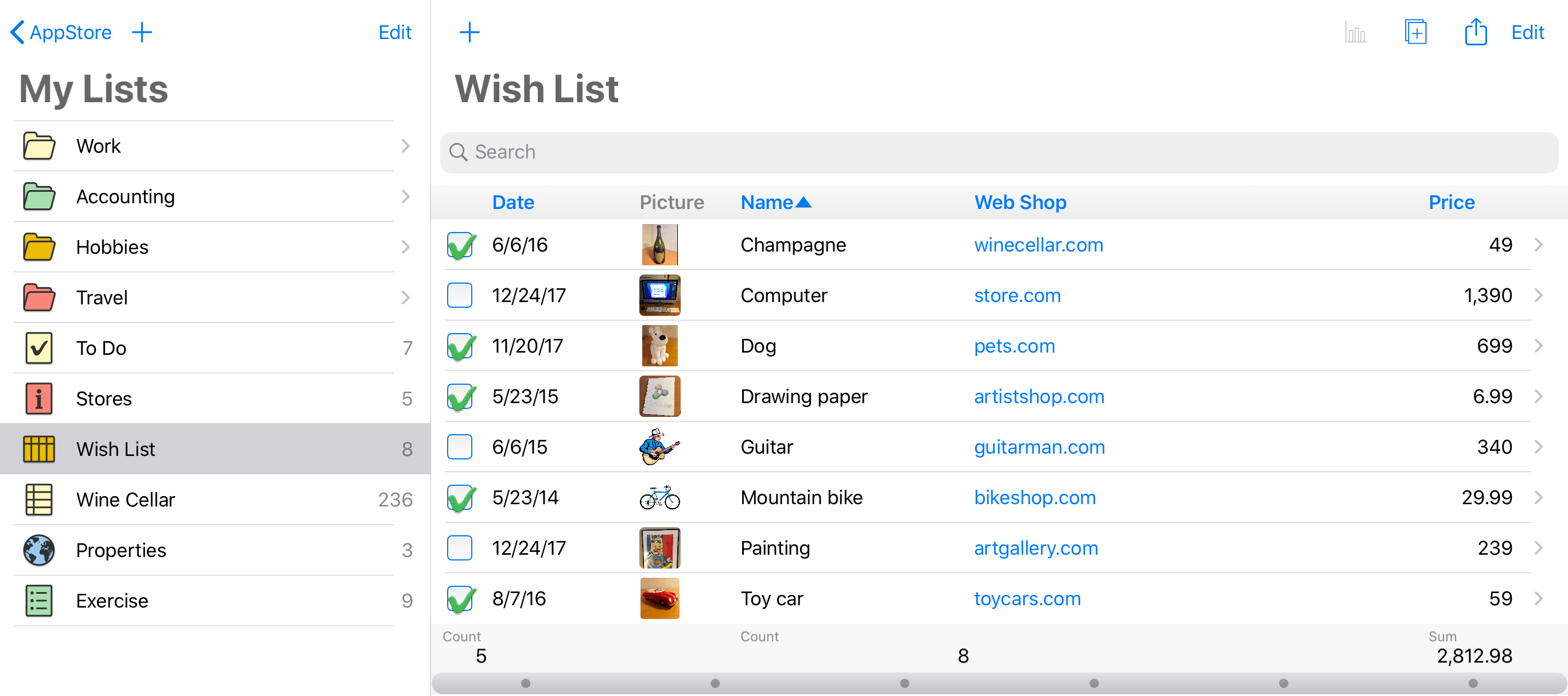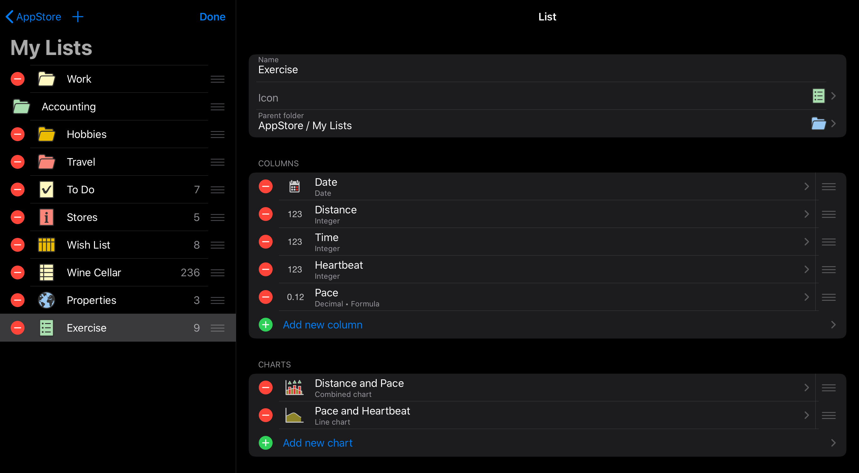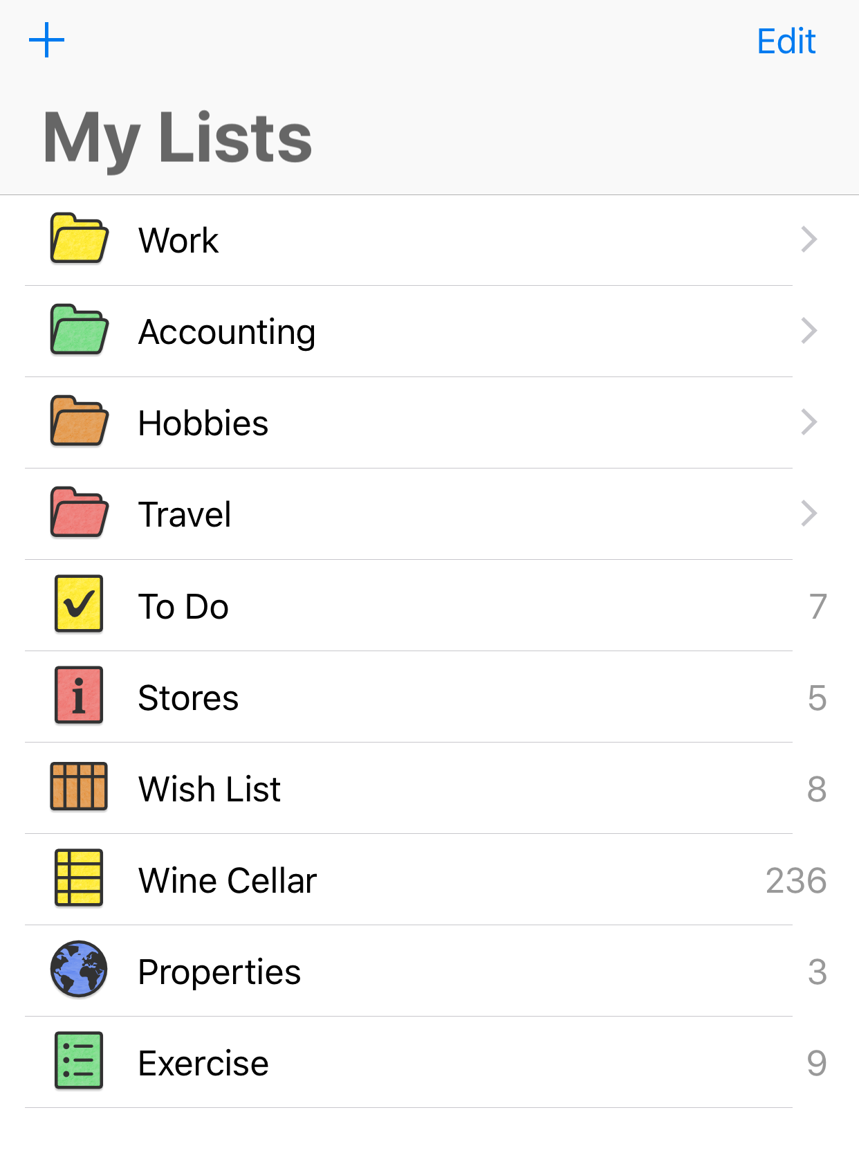 The app has a navigation view and a list view. In the navigation view you tap on lists and folders to show their content. In the navigation view, you can also switch to edit mode using the Edit button to edit lists and folders.