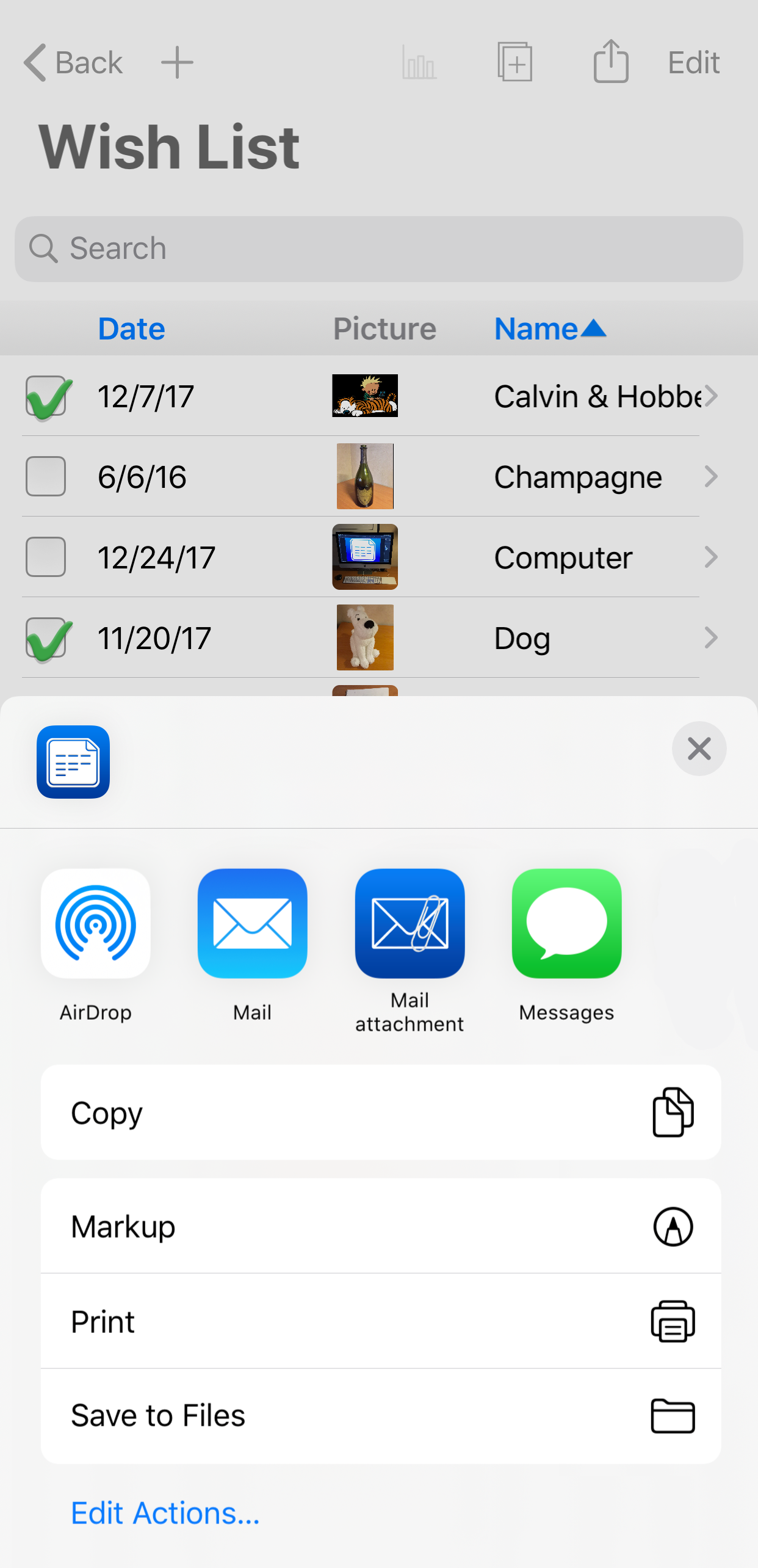 - Markup – a PDF document is created with the list contents and presented in a system markup editor. From here you can share it as a PDF to a destination of your choice (e.g. Save to Files, Print, or Copy).
